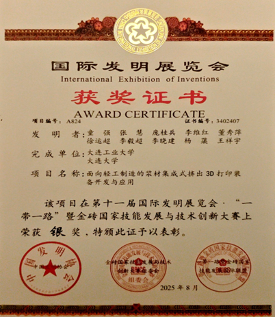 第十一届国际发明展览会在广州市成功举办,我校williamhill中国童强、张慧、庞桂兵等教师团队携项目《面向轻工制造的浆材集成式挤出3D打印装备开发与应用》参展,荣获国际发明展览会“一带一路”暨金砖国家技能发展与技术创新大赛银奖。该项目专注于食品、木塑等轻工材料的个性化快速制造需求,提出了多类浆料一体化3D打印解决方案,突破了传统设备在多种浆料适应性、系统集成度和跨行业应用方面的技术瓶颈,展示了我校在先进制造技术领域的创新成果。